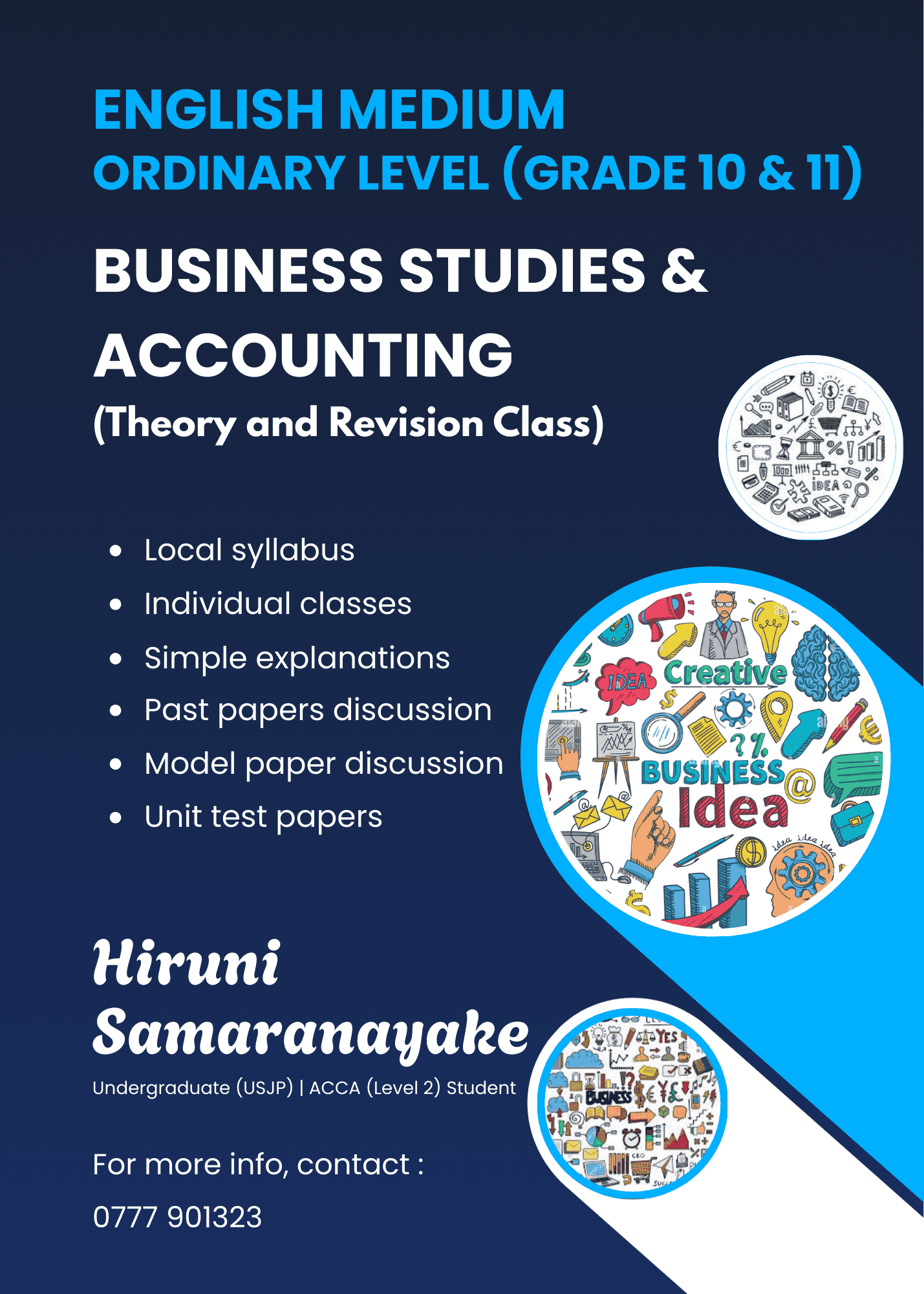 ENGLISH MEDIUM – ORDINARY LEVEL (GRADE 10 & 11) BUSINESS STUDIES & ACCOUNTING (Theory and Revision Class) …
