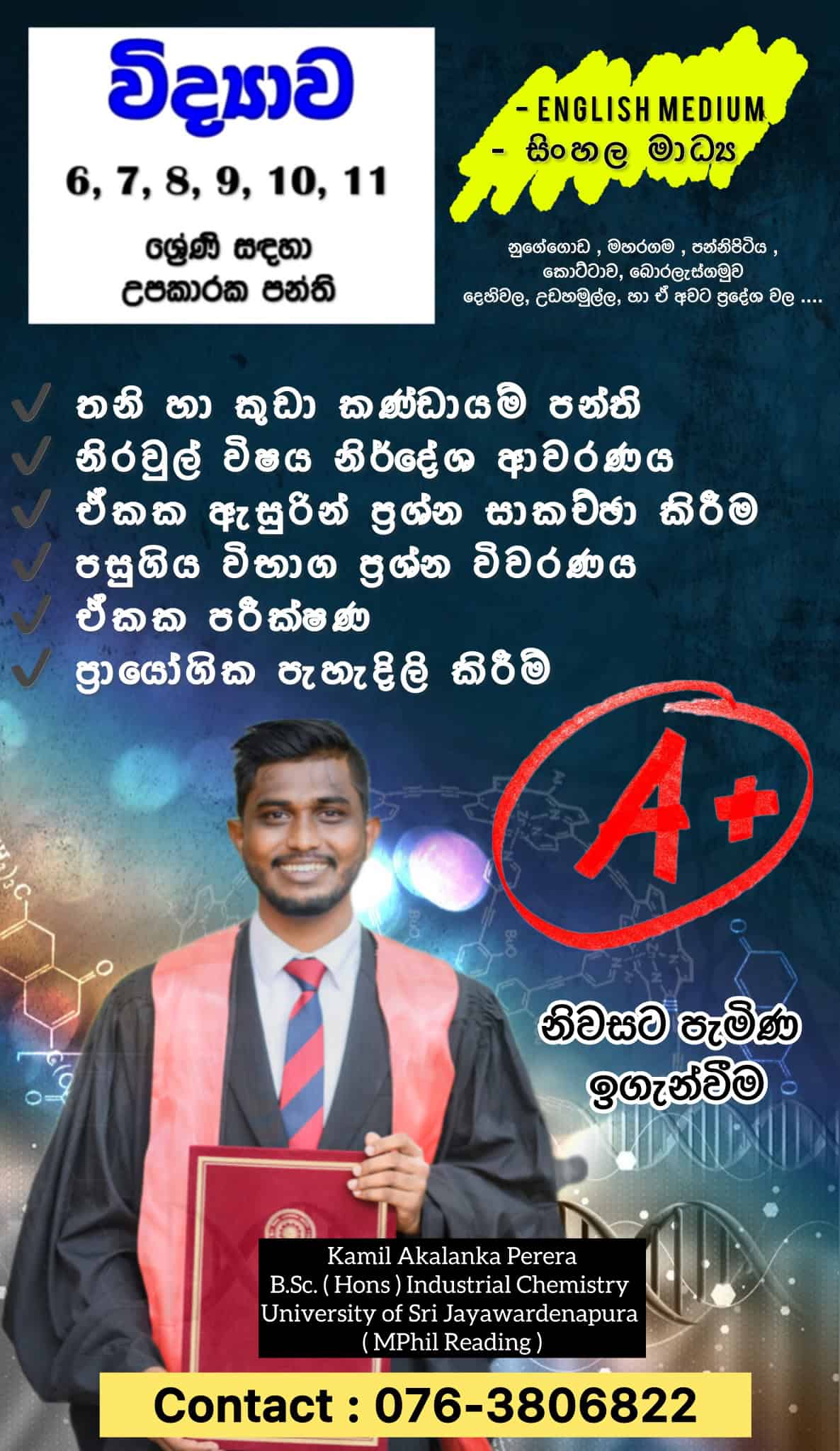 I am a well experienced teacher who is dedicated.Can understand each child’s psychology and capable of delivering knowledge according to that.Pay special attention on each children.Clarify doubts through questions.Do past papers and enhance their both theoretical and practicals knowledge.