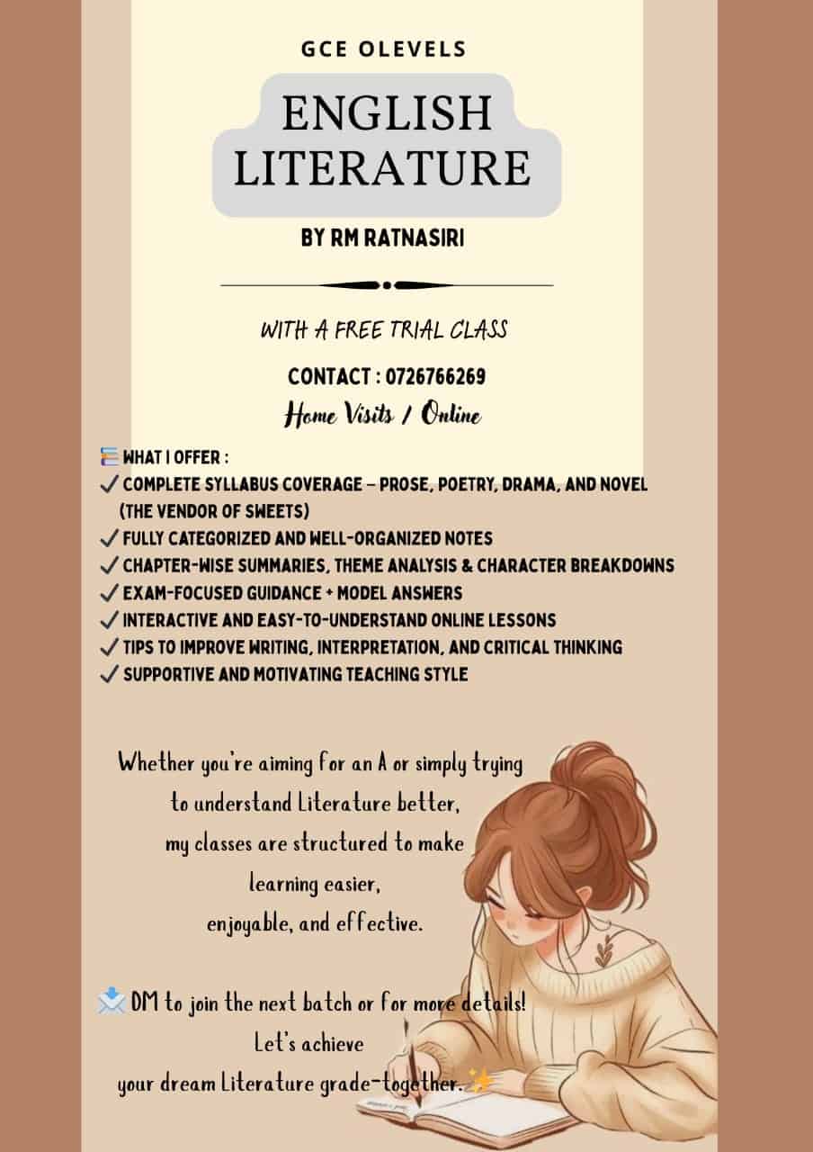 தமிழ் பாடத்தில் நீண்ட காலமாக முண்னணி வகிக்கும் ஆசிரியரால் தரம் 6 தொடக்கம் GCE AL வரை மாணவர்களுக்கான தனிப்பட்ட அல்லது குழுவிற்கான வகுப்புக்கள் நேரடியாக உங்கள் வீடுகளுக்கு வருகை தந்து கற்பிக்கப்படுவதோடு இலங்கையிலும் உலகின் வேறு பல நாடுகளிலும் மிகவும் தொலைதூரத்திலுள்ள மாணவர்களுக்கென தனியான மற்றும் குழுவான விசேட online வகுப்புக்களும் நடைபெறுகின்றன.